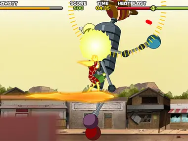 In this game Ben 10 is fighting a giant robot created by Megawatt. The robot is walking towards the hydro electric dam to power up. You must destroy it before it succeeds. Ben 10 has converted into Heatblast for this purpose. Heatblast is flying on some sort of board and shooting fireballs to the robot. The robot picks up cars and throws them towards Ben 10. Your goal is to avoid these cars and to hit the robot with fire balls.