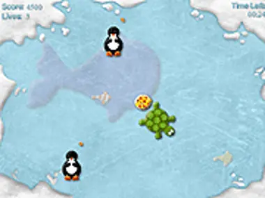 Diese schwindelige Schildkröte rutscht überall herum. Führe ihn weg von den schlafenden Pinguinen und in die Pizzen. Benutze die Pfeiltasten oder WASD, um die Schildkröte zu steuern. Sammle Pizzen und Kirschen, vermeide Pinguine.