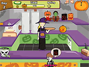 Manage your cake shop as you build and decorate cakes for kids. Buy new spooky products to sell.