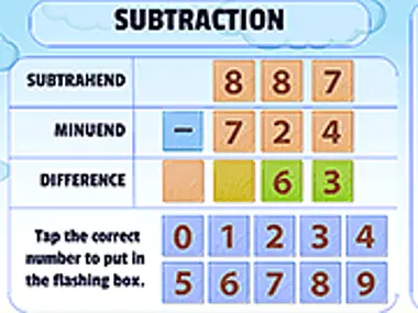 Dies ist ein Lernspiel zum Üben der mathematischen Subtraktion. Löse Subtraktionsaufgaben, genau wie du es auf Papier oder in einem Notizbuch tun würdest. Überprüfe deine Subtraktionsfähigkeiten und sieh, wie schnell du subtrahieren kannst. Es gibt zwei Modi. Der erste Modus ist ohne Übertrag und der zweite ist mit Übertrag.